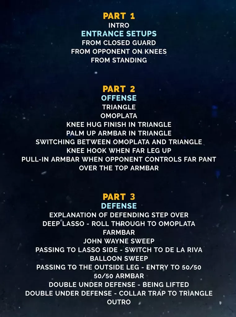 ·         Abrange uma ampla gama de conceitos essenciais, incluindo entradas, raspagens, finalizações e até mesmo ferramentas defensivas para a guarda de laço raso!