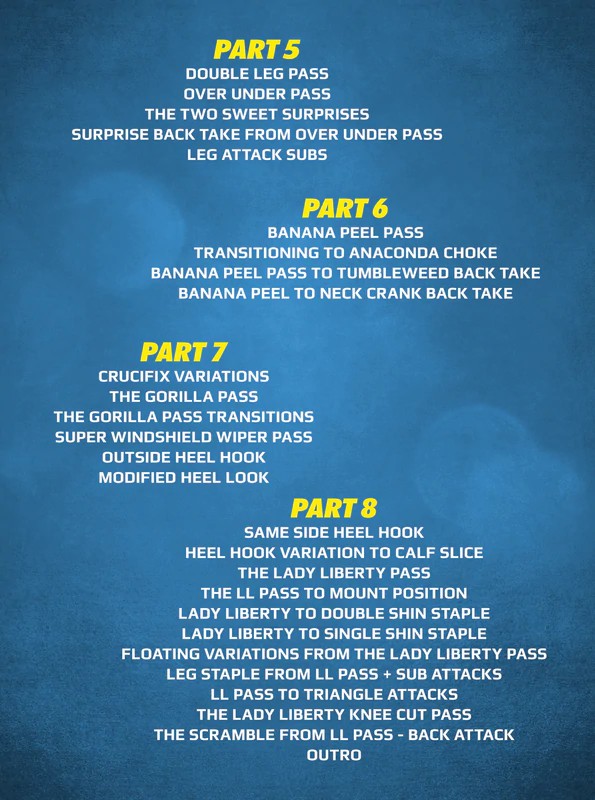 ·       Aprenda todas as formas mais eficazes de passar a meia guarda da joelheira nesta série de 8 volumes sobre a passagem da guarda do 12 vezes campeão mundial André Galvão