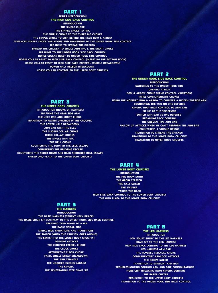 ·       Prenda os oponentes no controle das costas, onde cada tentativa de fuga pode levar a outras formas de controle das costas, como o crucifixo, o sistema de arnês e MAIS!
