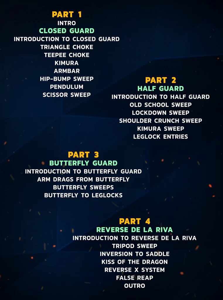 • Ataque todas as áreas do corpo com técnicas de alta porcentagem de guarda fechada, meia guarda, guarda borboleta, De la Riva invertida que você pode facilmente adicionar ao seu jogo