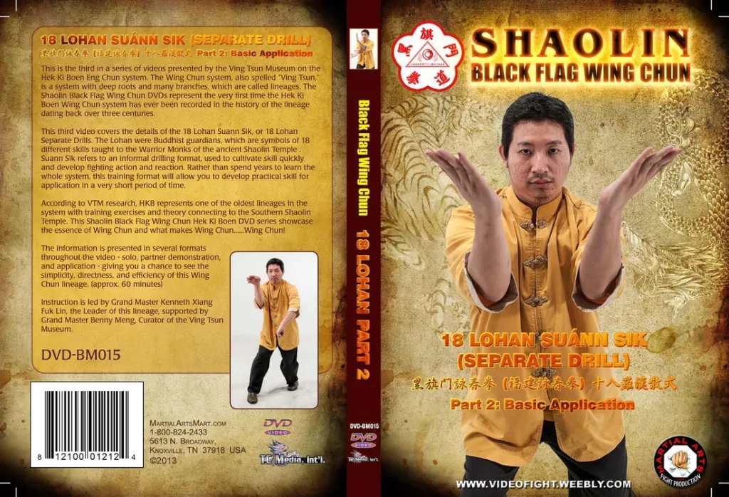 Shaolin Black Flag Wing Chun 18 Lohan Suann Sik Parte 2 Aplicações Básicas. Este é o terceiro de uma série de vídeos apresentados pelo Museu Ving Tsun sobre o sistema Hek Ki Boen Eng Chun. O sistema Wing Chun, também escrito Ving Tsun, é um sistema com raízes profundas e muitos ramos, que são chamados de linhagens. Os DVDs Shaolin Black Flag Wing Chun representam a primeira vez que o sistema Hek Ki Boen Wing Chun foi registrado na história da linhagem que remonta a mais de três séculos. Este terceiro O vídeo cobre os detalhes dos 18 Lohan Suann Sik, ou 18 Exercícios Separados de Lohan. Os Lohan eram guardiões budistas, que são símbolos de 18 habilidades diferentes ensinadas aos Monges Guerreiros do antigo Templo Shaolin. Suann Sik refere-se a um formato de perfuração informal, usado para cultivar habilidades rapidamente e desenvolver ações e reações de combate. Em vez de gastar anos aprendendo todo o sistema, esse formato de treinamento permitirá que você desenvolva habilidades práticas para aplicação em um período muito curto de tempo. De acordo com a pesquisa da VTM, o HKB representa um das linhagens mais antigas do sistema com exercícios de treinamento e teoria conectando ao Templo Shaolin do Sul. Esta série de DVD Shaolin Black Flag Wing Chun Hek Ki Boen mostra a essência do Wing Chun e o que faz o Wing Chun…Wing Chun! apresentado em vários formatos ao longo do vídeo – solo, demonstração com parceiro e aplicação – dando a você a oportunidade de ver a simplicidade, franqueza e eficiência desta linhagem Wing Chun. (aproximadamente 60 minutos) A instrução é liderada pelo Grão-Mestre Kenneth Xiang Fuk Lin, o Líder desta linhagem, apoiado pelo Grão-Mestre Benny Meng, Curador do Museu Ving Tsun.