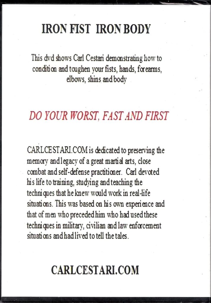 Descrição do produtoESTE DVD MOSTRA CARL DEMONSTRANDO COMO CONDICIONAR E ENDURECER OS PUNHOS, MÃOS, ANTES, COTOVELOS, CANELAS E CORPO. É um treinamento muito útil para nossos membros e corpo. E é o mesmo que no CCT Carl Cestari Isso tem cerca de 45 minutos de duração. Ele mostra como se fortalecer usando materiais que são muito baratos, ou mesmo gratuitos, enquanto você trabalha sozinho. O Sr. Cestari dá muito para mantê-lo ocupado. Você notará os resultados muito rapidamente. Se você estiver interessado em qualquer aspecto das artes marciais ou autodefesa, acho que isso será muito útil. É curto, mas há muito retorno para os investimentos. Eu recomendo altamente.