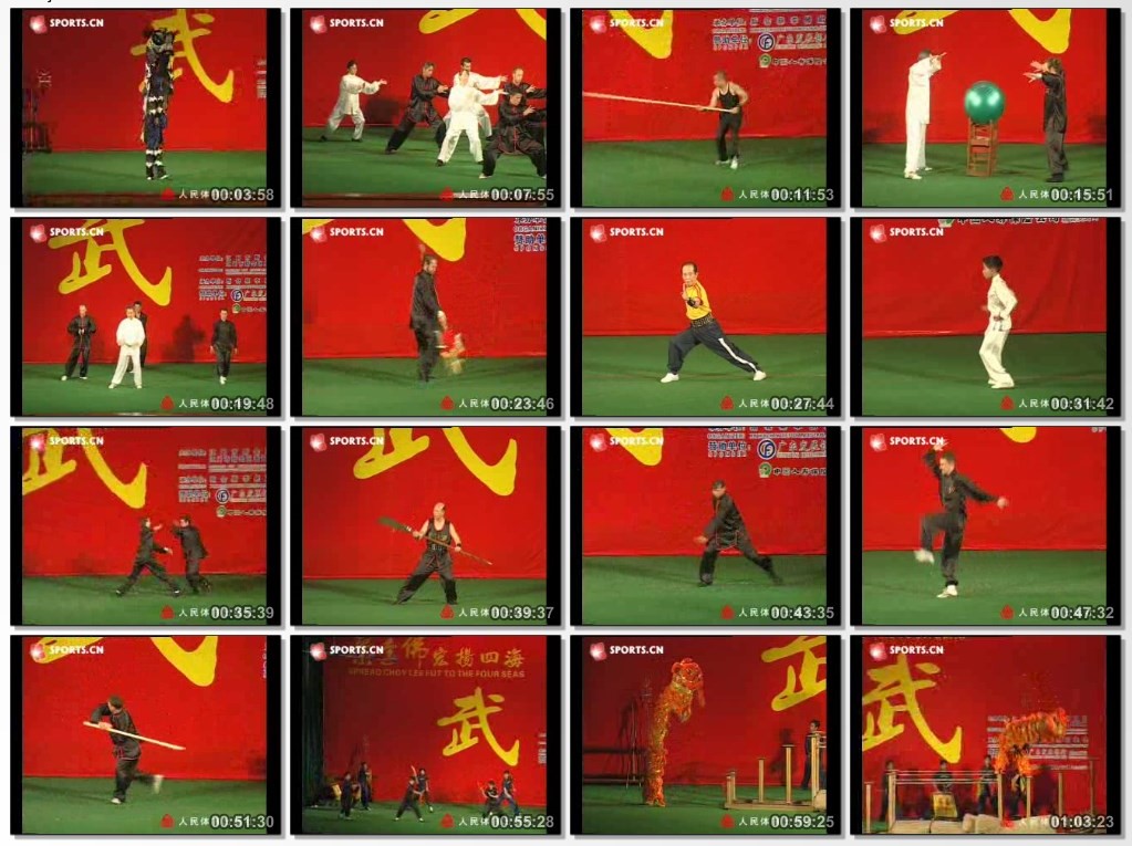 Em pé e atuando em frente a um banner ENORME em vermelho com um “WU” amarelo brilhante, esta trupe de jogadores de Choy Lai Fut e outros praticantes mostra uma pesquisa de estilos que lembram os dias felizes nos Estados Unidos. Uma demonstração em grupo dos fundamentos do CLF, Cajado Longo, Bola Chi Kung, quebra de tijolos, Sabre CLF, também formas não CLF, como Tigre / Guindaste, Lança vs. Sabre, Parceiros Tigres Gêmeos, Punho Longo, Tridente e um muito bom conjunto de faca de cavalo para um bom show. A lança CLF, a equipe CLF e até mesmo o CLF Fang Tian também são apresentados. |