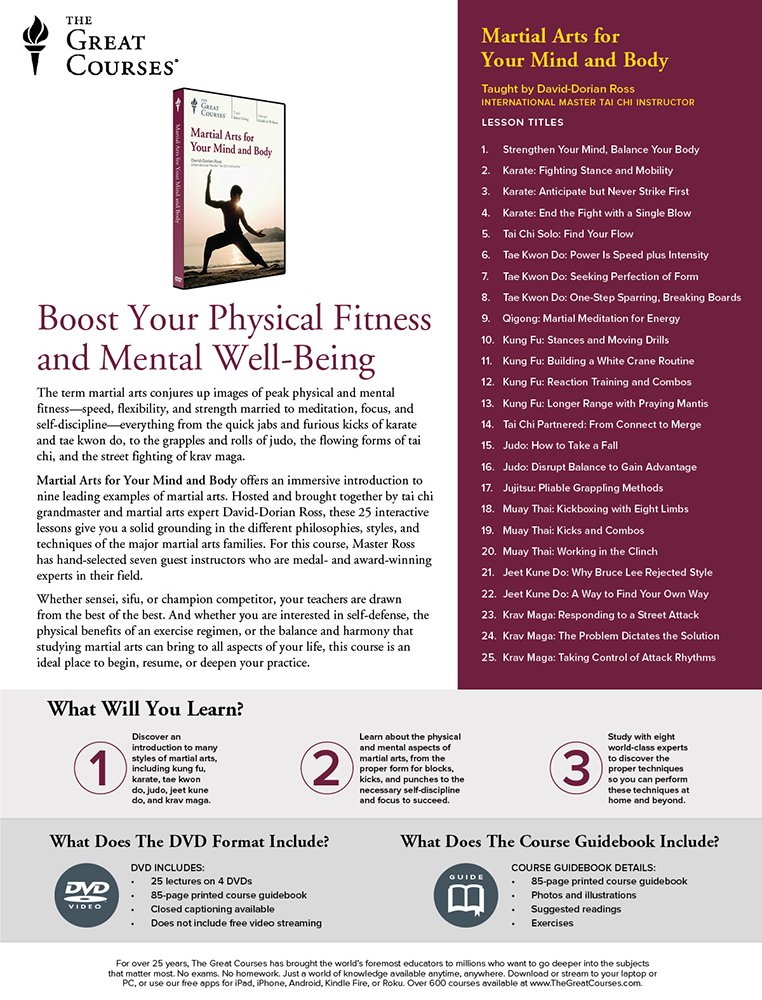 Visão geral do cursoArtes marciais. Esta frase evoca imagens do auge da aptidão física e mental – velocidade, flexibilidade e força combinadas com meditação, foco e autodisciplina, uma imagem amplificada por tudo, desde filmes elegantemente coreografados de Hollywood até partidas de gaiola de artes marciais mistas (MMA). Mas a realidade é que as “artes marciais” servem de guarda-chuva para uma incrível variedade de práticas benéficas e altamente especializadas, do kung fu ao tai chi ao jeet kune do. Um dos aspectos mais intimidantes de praticar artes marciais é aprender o suficiente para entender o que funciona melhor para você. Qual é a diferença entre praticar os jabs rápidos e os chutes furiosos do caratê e do tae kwon do, as garras e jogadas do judô, as formas fluidas do tai chi ou a força da luta de rua do Krav Maga? Essas formas de luta têm certas coisas em comum, mas cada prática tem sua própria filosofia única, bem como uma abordagem física e mental. E ainda, com muita freqüência, os alunos e futuros alunos nunca conseguem explorar em primeira mão e se beneficiar da gama de oportunidades nas artes marciais. Artes marciais para sua mente e corpo oferece uma introdução imersiva a nove exemplos importantes de artes marciais. Apresentadas e reunidas pelo Grão-Mestre David-Dorian Ross do tai chi, essas 25 aulas interativas (mais uma do que um curso normal) fornecem uma base sólida nas diferentes filosofias, estilos e técnicas das principais famílias das artes marciais. Para este curso, Mestre Ross selecionou a dedo sete instrutores convidados que são especialistas premiados em suas áreas. Seja sensei, sifu ou competidor campeão, seus professores são escolhidos entre os melhores dos melhores. Você não precisa ser um guerreiro de cross-training ou lutador de MMA para se beneficiar da exposição a uma variedade de artes marciais. Na verdade, com orientação adequada, a prática das artes marciais oferece benefícios físicos e mentais inestimáveis para pessoas de todas as idades, em todos os níveis de aptidão física. Da autodefesa aos benefícios físicos de um regime de exercícios disciplinados, ao equilíbrio e harmonia que o estudo das artes marciais pode trazer a todos os aspectos da sua vida, as Artes Marciais para o Seu Corpo e Mente são um lugar ideal para começar, retomar ou aprofundar sua prática. Pesquise nove famílias de artes marciais David-Dorian Ross elaborou uma pesquisa sobre as artes marciais, oferecendo uma base única para um treinamento físico e mental aprimorado, tudo o que pode ajudá-lo a identificar práticas e tradições específicas que podem ser especialmente benéficas para você. O curso permite que você experimente, embora com muito mais eficiência, os mesmos tipos de explorações que o Mestre Ross empreendeu quando era um jovem praticante, quando decidiu encontrar o estilo certo de artes marciais para si mesmo. Com sete instrutores convidados para acompanhá-lo, Mestre Ross leva você em um tour de: