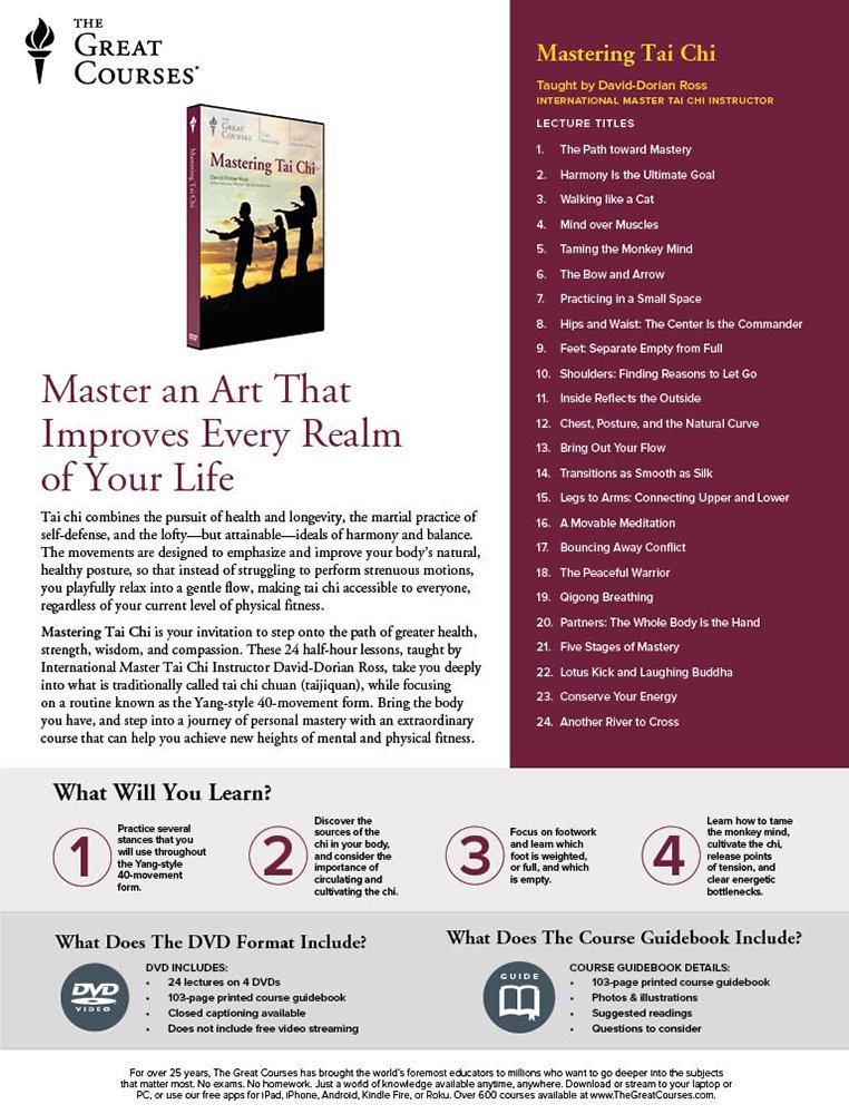 Dominar o Tai Chi é o seu convite para entrar no caminho da saúde, força, sabedoria e compaixão. Essas 24 lições de meia hora ministradas pelo instrutor do Mestre Internacional de Tai Chi, David-Dorian Ross, levam você profundamente ao que é tradicionalmente chamado de Tai Chi Chuan (Tai Chi Chuan), enquanto se concentra em uma rotina conhecida como a forma de 40 movimentos. Ao aprender este formulário, você também: