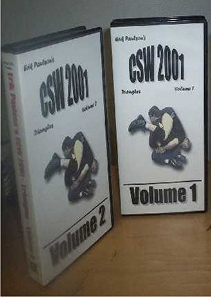 | CSW 2001 de Erik Paulson – Triângulos Volume 1. Este vídeo cobre triângulos da guarda e posições de quartel. 12 fluxos de triângulos diferentes são mostrados. Erik lhe mostrará passo a passo como aplicar seus apoios de acabamento. 1. Exercício de aquecimento / memória muscular de 5 contagens. 2. Arco e flecha de 9 contagens. 3. Contador de travamento de tornozelo traseiro usando o afogador triangular. 4. Contrair o Hip-In Guard Pass. 5. Contador de passes de proteção de pino de joelho usando o afogador triangular. 6. Contador de passes de proteção do pino de quadril usando o afogador do triângulo. 7. Estante Stack Counter usando o Triangle Choke # 1. 8. Posicione o contador de pilha usando o afogador triangular # 2. 9. Fluxo da posição do quarto 1. 10. Fluxo da posição do quarto 2. 11. Fluxo da posição do quarto 3. 12. Fluxo das posições do quarto 1 – 3. CSW de Erik Paulson 2001 – Triangles Volume 2. Este vídeo cobre triângulos de Kesagatame e posições laterais. 1. V-Arm Lock de Kosure Kesagatame. 2. Triângulo do ombro a partir da posição transversal do corpo. 3. Fluxo do triângulo de bloqueio do braço giratório. 4. Contrair o contador de garras de pulso com um triângulo de mergulho. 5. Inverta o Triângulo para a Trava de Compressão da Cabeça Sentada de Kosure Kesagatame. 6. Barra de braço reta para cruzar o triângulo do ombro do corpo. 7. Barra de braço reto para o triângulo do ombro para o gancho da perna Crunch lateral. 8. Helicóptero para travar o pescoço até o triângulo de joelhos. 9. Fluxo do triângulo de Kosure Kesagatame, terminando com um triângulo lateral. 10. Bloqueios de Kesagatame padrão para o triângulo lateral.