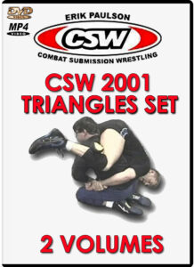 | CSW 2001 de Erik Paulson – Triângulos Volume 1. Este vídeo cobre triângulos da guarda e posições de quartel. 12 fluxos de triângulos diferentes são mostrados. Erik lhe mostrará passo a passo como aplicar seus apoios de acabamento. 1. Exercício de aquecimento / memória muscular de 5 contagens. 2. Arco e flecha de 9 contagens. 3. Contador de travamento de tornozelo traseiro usando o afogador triangular. 4. Contrair o Hip-In Guard Pass. 5. Contador de passes de proteção de pino de joelho usando o afogador triangular. 6. Contador de passes de proteção do pino de quadril usando o afogador do triângulo. 7. Estante Stack Counter usando o Triangle Choke # 1. 8. Posicione o contador de pilha usando o afogador triangular # 2. 9. Fluxo da posição do quarto 1. 10. Fluxo da posição do quarto 2. 11. Fluxo da posição do quarto 3. 12. Fluxo das posições do quarto 1 – 3. CSW de Erik Paulson 2001 – Triangles Volume 2. Este vídeo cobre triângulos de Kesagatame e posições laterais. 1. V-Arm Lock de Kosure Kesagatame. 2. Triângulo do ombro a partir da posição transversal do corpo. 3. Fluxo do triângulo de bloqueio do braço giratório. 4. Contrair o contador de garras de pulso com um triângulo de mergulho. 5. Inverta o Triângulo para a Trava de Compressão da Cabeça Sentada de Kosure Kesagatame. 6. Barra de braço reta para cruzar o triângulo do ombro do corpo. 7. Barra de braço reto para o triângulo do ombro para o gancho da perna Crunch lateral. 8. Helicóptero para travar o pescoço até o triângulo de joelhos. 9. Fluxo do triângulo de Kosure Kesagatame, terminando com um triângulo lateral. 10. Bloqueios de Kesagatame padrão para o triângulo lateral.