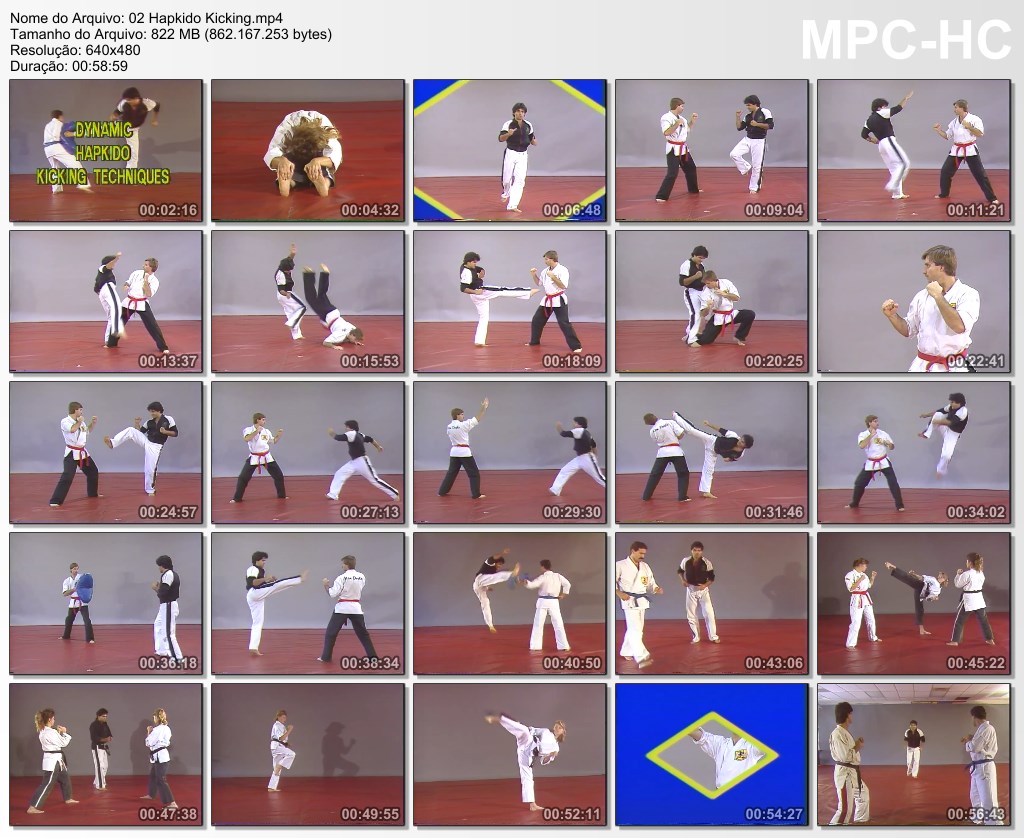 Flying, jumping, spinning, and multiple kicks. (approx. 57 mins) Esta série inclui todos os requisitos para Faixa Preta de 1º Grau. Hapkido é uma arte marcial coreana altamente eclética. É uma forma de autodefesa que emprega chaves conjuntas, agarramento e técnicas de arremesso semelhantes às de outras artes marciais, bem como chutes, socos e outros ataques impressionantes. Também ensina o uso de armas tradicionais, incluindo faca, espada, corda, ssang juhl bong (nunchaku), bengala (ji pang ee), bastão curto (dan bong) e bastão de comprimento médio, e bo, que variam em ênfase. dependendo da tradição particular examinada. O Hapkido emprega técnicas de luta de longo alcance e de curto alcance, utilizando chutes saltitantes e golpes de mão percussivos em distâncias mais longas, e golpes de ponto de pressão, travas articulares e arremessos em distâncias de luta mais próximas. O Hapkido enfatiza o movimento circular, o redirecionamento da força e o controle do oponente. Os praticantes procuram ganhar vantagem sobre seus oponentes através do footwork e posicionamento do corpo para incorporar o uso de alavancagem, evitando o uso de força bruta contra força bruta. A arte foi adaptada do Daito-ryu Aiki-jujutsu como foi ensinado por Choi Yong-Sool quando ele retornou à Coréia após a Segunda Guerra Mundial depois de ter vivido no Japão por 30 anos. Este sistema foi posteriormente combinado pelos discípulos de Choi com técnicas de chutes e golpes de artes indígenas e contemporâneas como Taekkyeon e Tang Soo Do; bem como várias técnicas de arremesso e luta no solo do Judô Japonês. |