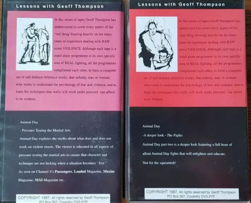 | Animal Day Pressure Testing the Martial Arts 2 VOLUMES ’If realism is your aim then these videos are for you. They contain manual training routines and complete animal day fights’ Starring: Geoff Thompson Running Time: 60 mins + 50 MINS Produzido com a intenção de educar o praticante em todos os aspectos “teste de pressão” as artes marciais para garantir que a técnica e o caráter ajuste quando realmente importa. Este DVD pretende explodir os mitos sobre o que funciona e o que não funciona em artes marciais em ruas perigosas de hoje. Sobre o autor Convencido de que deve haver mais vida do que isso, Geoff decidiu se tornar um instrutor de artes marciais (entrevistados como o número um instrutor de auto-defesa no mundo pela revista Black Belt EUA), em seguida, seguiu esta vivendo o seu sonho de se tornar um escritor. Ele é agora o autor de trinta e quatro livros, cinco-premiado multi-filmes (dois BAFTA nomeado, um BAFTA vencendo), duas peças de teatro e centenas de artigos publicados. Autobiografia de Geoff, Watch My Back, foi adaptado em um grande filme, batidos. |