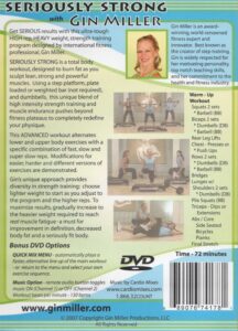Gin Miller lidera este exercício de força AVANÇADA usando PESOS PESADOS com ALTA REPETIÇÃO. SERIAMENTE FORTE é um treino total do corpo que é projetado para queimar gordura e magra. As opções de equipamentos incluíam barra, 3 conjuntos de halteres e uma plataforma de step. Era uma barra. O DVD oferece 2 menus – o menu principal reproduz o treino completo, incluindo testes de esforço, configurações e introduções. Esta é uma versão rápida e rearranjada dos grupos musculares. Botão de áudio Os bpms de treino são 130.