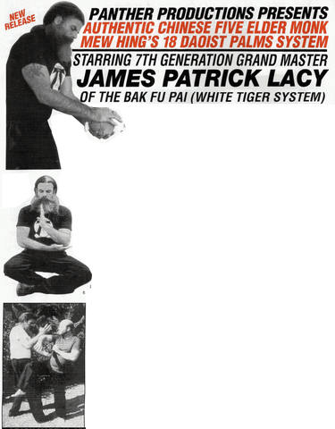 Fita 4: 18 Palmas Daoístas: Punho Contínuo de Sete Estrelas de Duas Pessoas e Sete Estrelas O monge dos Cinco Anciões Mew Hing era considerado o mais reservado dos Cinco Anciões. Pode-se ter um gostinho do sabor do sistema 18 Daoist Palms por meio desta primeira forma no sistema. Este formulário é bastante extenso e é uma combinação de técnicas de mão longa e mão curta. Estão incluídas manobras de perna, variações de trabalho dos pés, angulação, uma miríade de golpes com a mão de ferro, técnicas incomuns de cotovelo e excelentes técnicas de armadilha e bloqueio. Esta forma é um ótimo treino físico e uma introdução ao autêntico Five Elder Kung Fu. A Panther Productions é a distribuidora exclusiva dessas fitas e a primeira na história mundial a mostrar o material dessas nove fitas profissionalmente. As avarias da autodefesa são mostradas e o formulário para duas pessoas está incluído. Também é mostrado como fazer a forma de duas pessoas como forma solo. Mew Hing e Hee Shin Shim Shee, fundadores de 18 Daoist Palms e Northern Shaolin respectivamente, foram mortos pelo monge traidor Bak Mae. Mais tarde, Bak Mae foi morto pelo líder Tigre Branco e professor fundador dos Cinco Anciões, Fung Doe Duk. Apenas Fung Doe Duk e Ng Mui sobreviveram. Fung Doe Duk ensinou meu professor. O sistema de Mew Hing foi mantido em segredo até 1988, quando o título de Jung Shee da 7ª geração foi passado para James Patrick Lacy. É a primeira vez na história mundial que é oferecido ao público. Tornei o sistema ainda mais exclusivo incorporando Tigre Branco, Sobrancelha Branca, Shil Lum do Norte e Flor de Ameixa que conheci.
