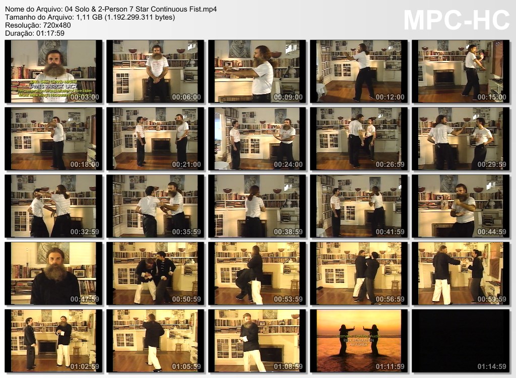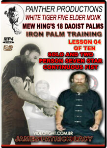 Fita 4: 18 Palmas Daoístas: Punho Contínuo de Sete Estrelas de Duas Pessoas e Sete Estrelas O monge dos Cinco Anciões Mew Hing era considerado o mais reservado dos Cinco Anciões. Pode-se ter um gostinho do sabor do sistema 18 Daoist Palms por meio desta primeira forma no sistema. Este formulário é bastante extenso e é uma combinação de técnicas de mão longa e mão curta. Estão incluídas manobras de perna, variações de trabalho dos pés, angulação, uma miríade de golpes com a mão de ferro, técnicas incomuns de cotovelo e excelentes técnicas de armadilha e bloqueio. Esta forma é um ótimo treino físico e uma introdução ao autêntico Five Elder Kung Fu. A Panther Productions é a distribuidora exclusiva dessas fitas e a primeira na história mundial a mostrar o material dessas nove fitas profissionalmente. As avarias da autodefesa são mostradas e o formulário para duas pessoas está incluído. Também é mostrado como fazer a forma de duas pessoas como forma solo. Mew Hing e Hee Shin Shim Shee, fundadores de 18 Daoist Palms e Northern Shaolin respectivamente, foram mortos pelo monge traidor Bak Mae. Mais tarde, Bak Mae foi morto pelo líder Tigre Branco e professor fundador dos Cinco Anciões, Fung Doe Duk. Apenas Fung Doe Duk e Ng Mui sobreviveram. Fung Doe Duk ensinou meu professor. O sistema de Mew Hing foi mantido em segredo até 1988, quando o título de Jung Shee da 7ª geração foi passado para James Patrick Lacy. É a primeira vez na história mundial que é oferecido ao público. Tornei o sistema ainda mais exclusivo incorporando Tigre Branco, Sobrancelha Branca, Shil Lum do Norte e Flor de Ameixa que conheci.