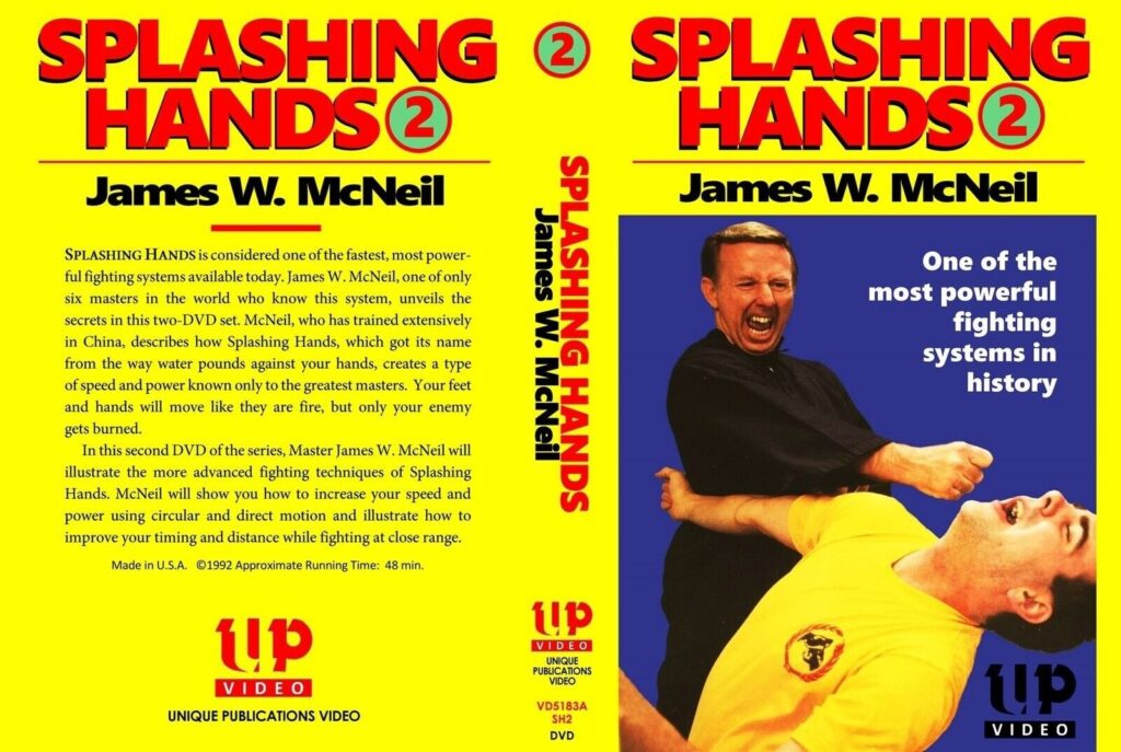 | Volume 2 Apresentando James McNeil Com base na forma como a água bate nas mãos, Splashing Hands é considerado um dos sistemas de luta mais rápidos e poderosos disponíveis atualmente. James W. McNeil treinou extensivamente na China e é um dos apenas seis Mestres no mundo que conhecem este sistema, revela os segredos nesta série de dois DVDs. James continua com sua lição sobre as Mãos Espirrando, ilustrando as técnicas de luta mais avançadas. Ele mostra como aumentar sua velocidade e força usando movimentos circulares e diretos e ilustra como melhorar seu tempo e distância enquanto luta de perto. 48 minutos. 1992 Remasterizado digitalmente a partir do videocassete original.