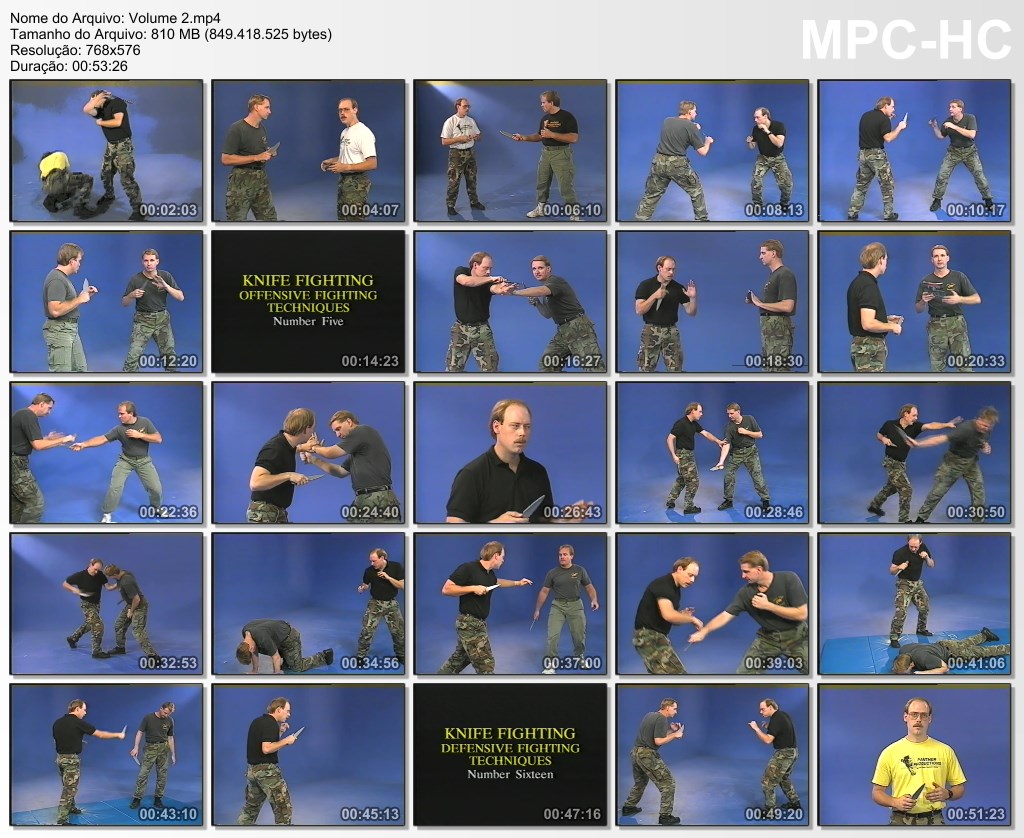 Drawing your blade plus numerous offensive and defensive knife fighting techniques against a deadly knife wielding attacker. (approx. 55 mins) 02. Green Beret Knife Fighting Combat Volume 2: Saque da lâmina, além de inúmeras técnicas de luta com faca ofensivas e defensivas contra um atacante mortal que empunha uma faca. (aprox. 55 min)