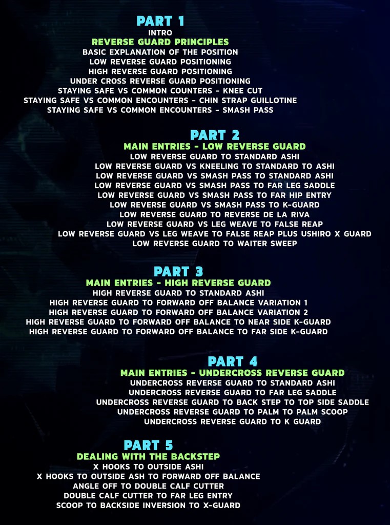 • A Guarda Reversa é uma posição poderosa que qualquer um pode usar para parar os transeuntes de guarda, enquanto configura inúmeras varreduras, entradas de pernas e MAIS!