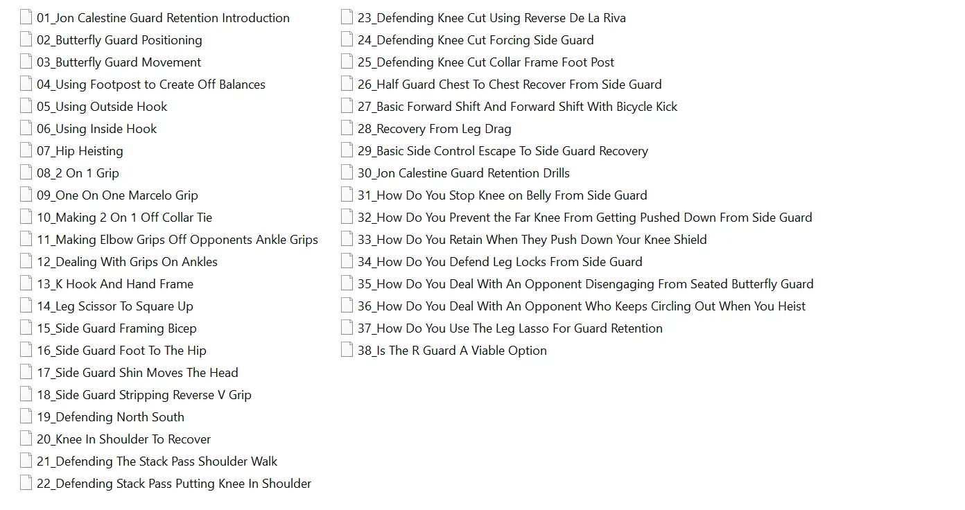 Junte-se ao campeão da EBI e renomado especialista em Jiu-Jitsu Brasileiro Jon Calestine em um curso instrucional aprofundado sobre Retenção de Guarda, uma das habilidades mais fundamentais do Jiu-Jitsu. Este guia abrangente foi criado para beneficiários praticantes de todos os níveis – de novatos na faixa branca a faixas pretas experientes.