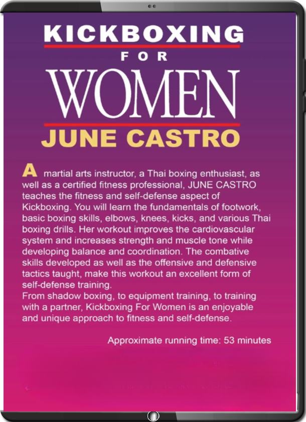 Top martial arts instructor, Muay Thai boxing enthusiast and certified fitness professional, June Castro teaches the fitness and self-defense aspects of Kickboxing. In this DVD you will learn the fundamentals of footwork; basic boxing skills; elbows; knees; kicks and various Thai boxing drills.  Her workout improves the cardiovascular system and increases strength and muscle tone while developing balance and coordination.  The combative skills developed as well as the offensive and defensive tactics taught; make this workout an excellent form of self-defense training.  From shadow boxing; to equipment training; to training with a partner; Kickboxing For Women is an enjoyable and unique approach to fitness and self-defense.  53 minutes.