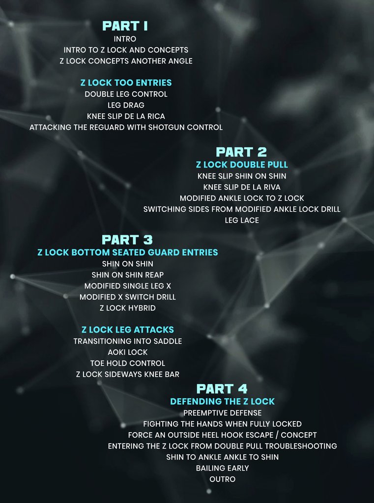 | Junny Ocasio compartilha sua abordagem inovadora para o Z Lock, uma apresentação que abre uma nova fronteira de ataques de perna e embaraços! · Desenvolva um sistema completo em torno do Z Lock, um bloqueio de quadril que pode surpreender completamente seu oponente e ajudá-lo a proteger o toque. · Enrole-se no Z Lock de cima para baixo, puxão de proteção dupla e MAIS! · Desligue as opções de ataque do seu oponente com os controles de imobilização do Z Lock. · Junny divide as técnicas de uma forma que garante que você sempre saiba o que fazer e quando fazer · Solucione cada posição para saber como seu oponente reagirá e como você pode tirar vantagem!