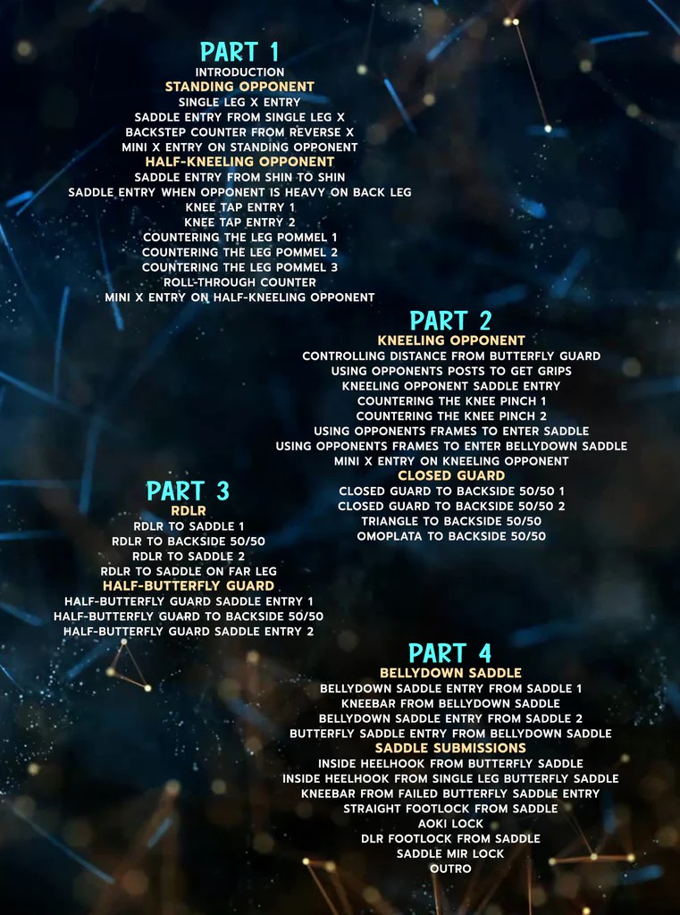 ·         Construa confiança a partir da posição de guarda aberta/por baixo, criando um jogo de leglock diversificado que permite controlar a ação enquanto garante uma ampla variedade de finalizações.