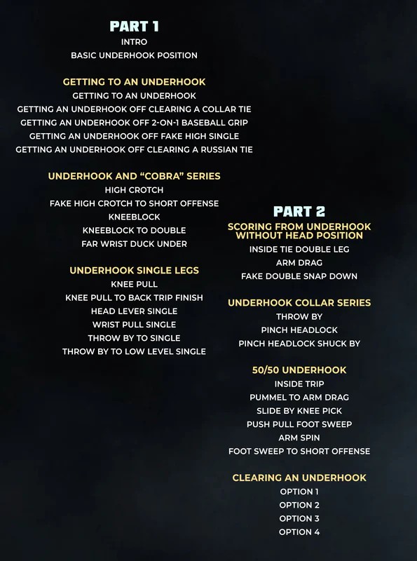 • Aprenda o ataque do underhook que Kyle aprimorou e aperfeiçoou, incluindo sua série cobra e como marcar no underhook 50/50 e marcar com má posição da cabeça