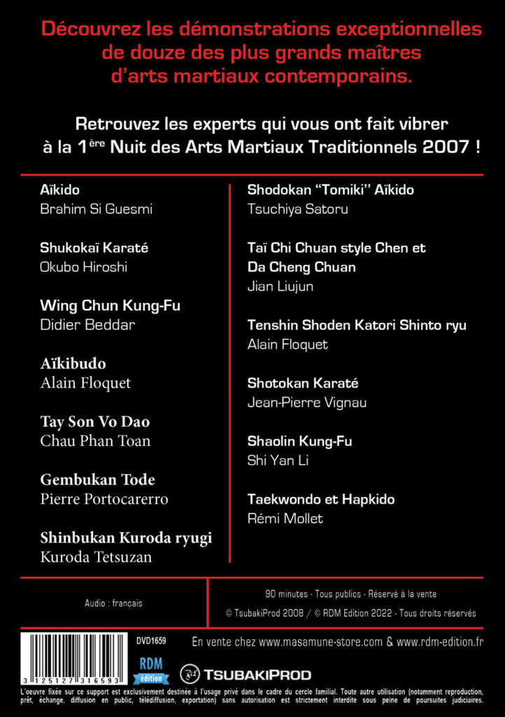 | Descubra demonstrações excepcionais de doze dos maiores mestres contemporâneos das artes marciais. Conheça os especialistas que emocionaram você na Noite das Artes Marciais de 2007! Aikido: Brahim Si Guesmi – Shukokaï Karate: Okubo Hiroshi – Wing Chun Kung-Fu: Didier Beddar – Aikibudo: Alain Floquet – Tay Son Vo Dao: Chau Phan Toan – Gembukan Tode: Pierre Portocarerro – Shinbukan Kuroda ryugi: Kuroda Tetsuzan – Shodokan « Tomiki» Aikido: Tsuchiya Satoru – Estilo Taï Chi Chuan Chen e Da Cheng Chuan: Jian Liujun – Tenshin Shoden Katori Shinto ryu: Alain Floquet – Karatê Shotokan: Jean-Pierre Vignau – Shaolin Kung-Fu: Shi Yan Li – Taekwondo e Hapkido: Rémi Mollet Duração: 90 minutos lingua francesa |
