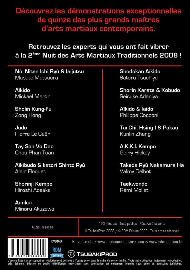 | Resumo do DVD: Descubra demonstrações excepcionais de quinze dos maiores mestres contemporâneos das artes marciais. Conheça os especialistas que emocionaram você na 2ª Noite de Artes Marciais Tradicionais 2008! Nô, Niten Ichi Ryû e Iaïjutsu: Masato Matsuura – Aïkido: Mickaël Martin – Sholin Kung-Fu: Zong Hong – Judô: Pierre Le Caër – Tay Son Vo Dao: Chau Phan Toan – Aïkibudo & katori Shinto Ryû: Alain Floquet – Shorinji Kempo : Hiroshi Aosaka – Aunkai: Minoru Akuzawa – Shodokan Aikido: Satoru Tsuchiya – Shorin Karate & Kobudo: Seisuke Adaniya – Aikido & Iaïdo: Philippe Cocconi – Taï Chi, Hsing I & Pakau: Kunlin Zhang – A.K.K.I. Kempo: Gerry Hickey – Takeda Ryû Nakamura Ha: Valmy Delbot – Taekwondo: Rémi Mollet Duração: 120 minutos lingua francesa |