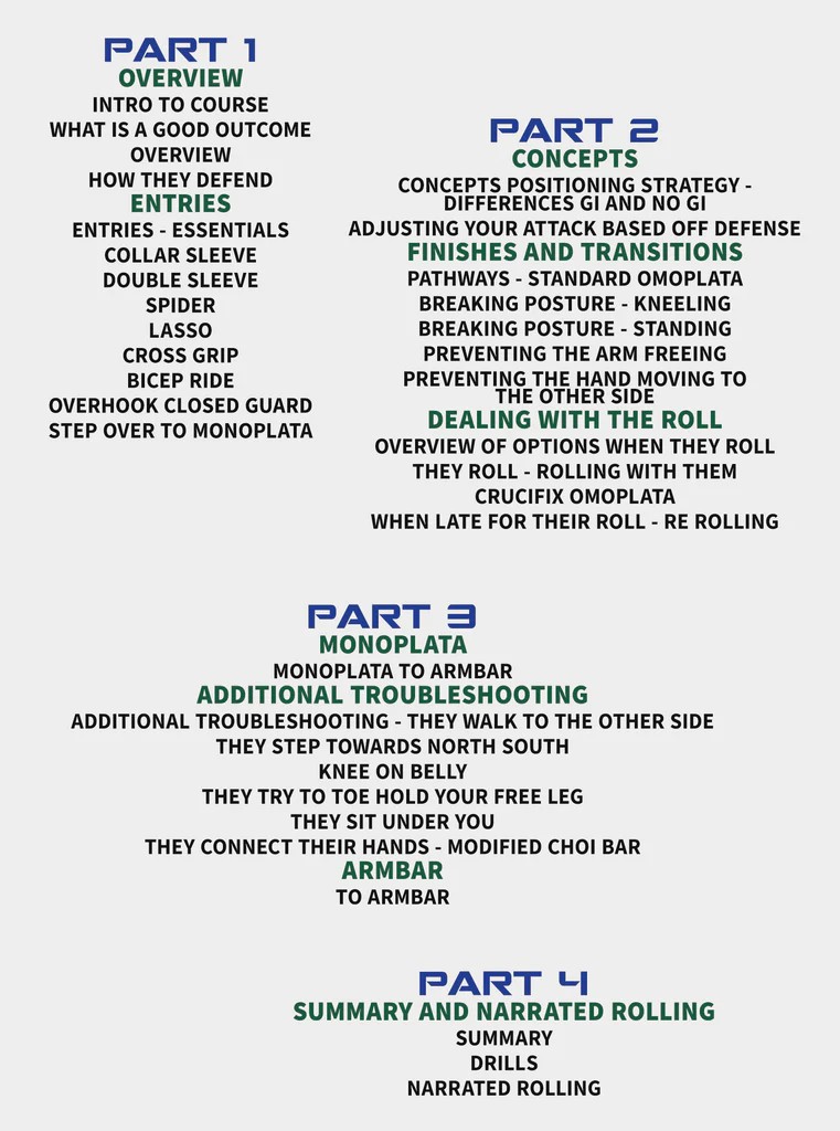 | Lachlan Giles apresenta o guia definitivo para a Omoplata com uma série de 4 partes dedicadas a inscrições, variações de finalização, tratamento de defesa e muito mais! · Lachlan Giles não é apenas um competidor de primeira linha, ele é um dos melhores instrutores do esporte! · Faça da Omoplata uma arma versátil em seu jogo, não apenas para finalizar os oponentes, mas também para capitalizar suas defesas com raspagens e transições para outras posições dominantes. · Giles detalha conceitos para variações de Omoplata com kimono e sem kimono. · Solucione problemas/contra-ataques comuns enquanto Lachlan detalha conceitos como quebra de postura contra oponentes em pé/ajoelhados, impedindo que o braço seja liberado e muito mais! · Lide com os oponentes que avançam durante a Omoplata com estratégias de ataque, incluindo o re-roll e o crucifixo. · Lachlan também inclui uma visão extensa do ataque monoplata, uma técnica essencial para completar seu arsenal Omoplata!
