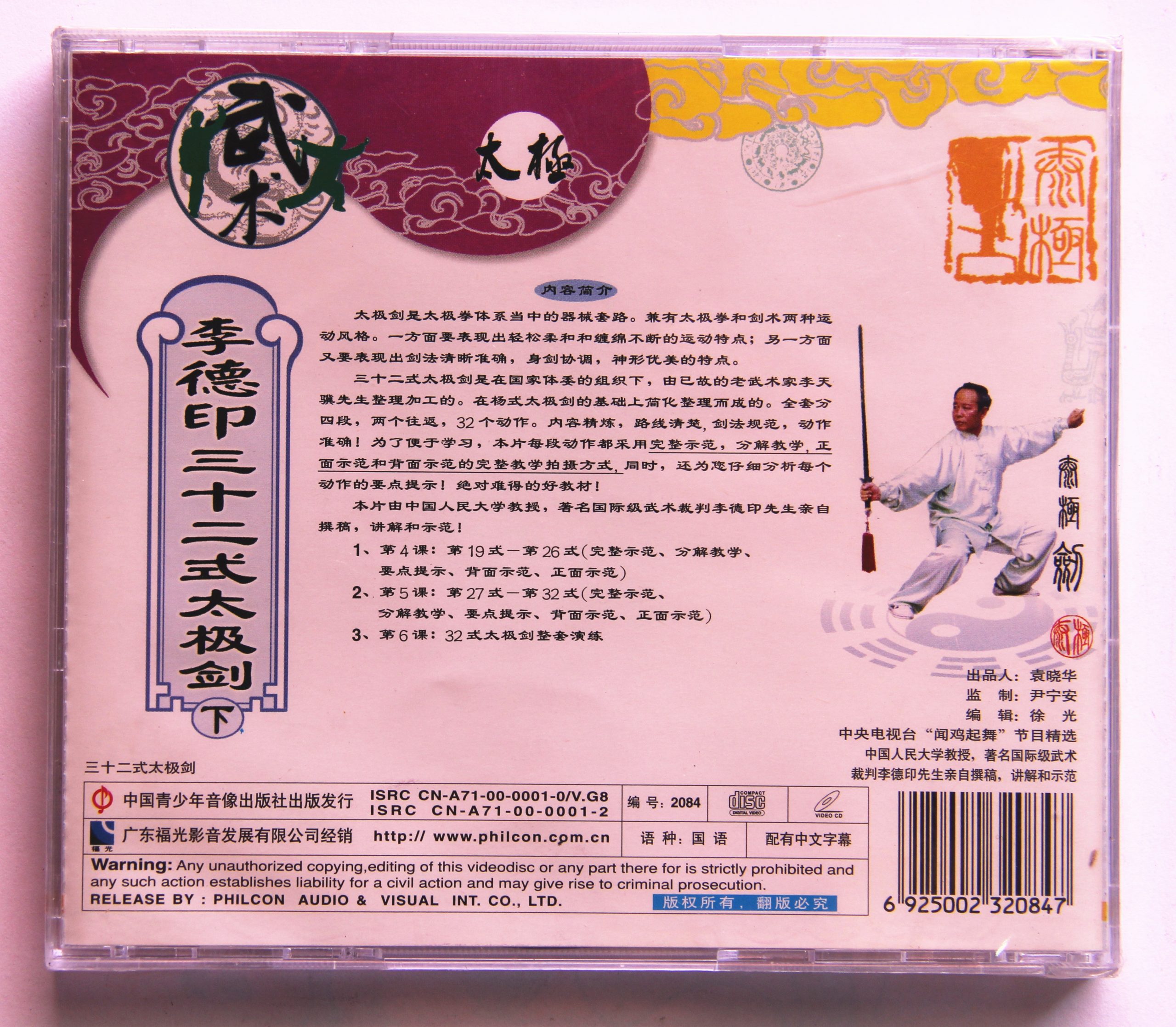 Extras Informação: O complexo é mostrado – Taolu 32 formas de Taiji com uma espada direta (jian). A análise detalhada do desempenho de todos os movimentos em velocidade normal e lenta. O nome de cada movimento é duplicado por legendas em chinês.