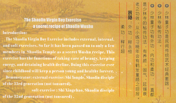 O exercício Shaolin do Menino Virgem inclui exercícios externos, internos e suaves. Até agora, foi repassado a apenas alguns membros no Templo Shaolin como uma receita secreta de Wushu. Este exercício tem como funções cuidar da beleza, manter a energia e deter o declínio da saúde. Fazer este exercício desde a infância manterá a pessoa jovem e saudável para sempre.