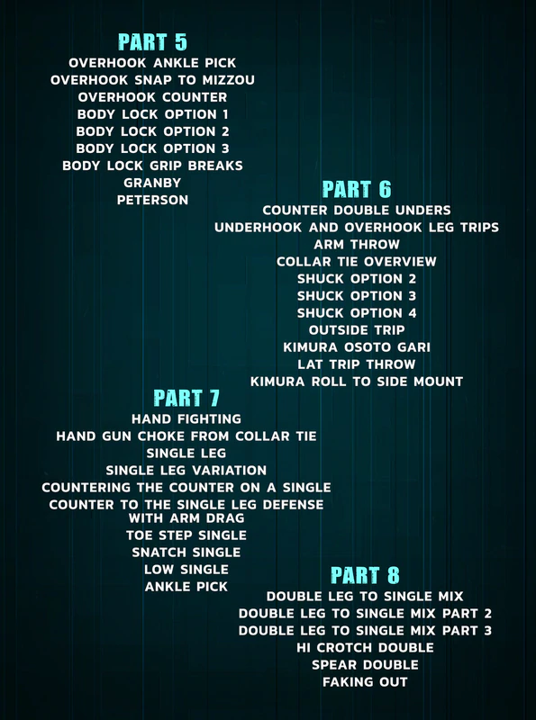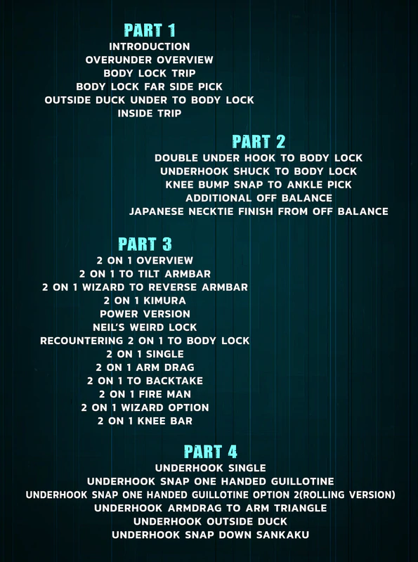 Esteja você procurando por quedas para autodefesa, MMA ou BJJ, Neil oferece um sistema exclusivo que permite que você ganhe o controle, configure a queda e EXECUTE! Um tema principal da série é como ganhar controle significativo sobre os oponentes para tornar as quedas mais eficientes e menos previsíveis. Você aprenderá como utilizar 2 contra 1 e controlar gravatas de alto nível, onde será capaz de bloquear o ataque do seu oponente, enquanto abre oportunidades para tropeções, pegadas de tornozelo, single leg, double leg e MAIS!