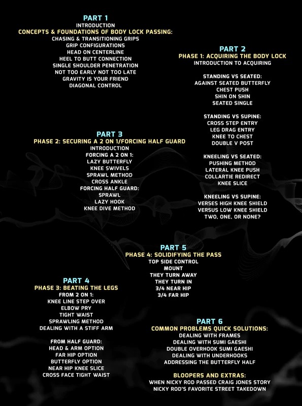 | Body Lock para passar pela guarda com esta abordagem passo a passo para a passagem com o cofundador da equipe B e finalista do ADCC, Nick Rodriguez, sistema exclusivo “Rody Lock” para grapplers de todos os níveis · Aprenda os fundamentos da passagem do body lock com a explicação de Nick sobre as pegadas, pressão e controles necessários para iniciar o ataque · Siga passo a passo o passe com os conselhos de Nick sobre como forçar a meia-guarda ou bater as pernas para chegar a posições de passe dominantes · Nick Rodriguez é um dos melhores grapplers peso-pesado do mundo, e o finalista do ADCC 2019 usa esse body lock como seu passe característico para quebrar a guarda de grapplers muito mais experientes. · Prenda as travas do corpo contra os protetores sentados e supinos, tanto dos joelhos quanto dos pés, enquanto Nicky mostra como você pode tornar isso parte do seu jogo em qualquer lugar · Encontre soluções para problemas comuns enquanto Nick ajuda você a resolver problemas em diferentes contadores, como underhooks, sumi gaeshi e muito mais · Use deslizamentos de joelho, socos nas pernas, passagens de meia guarda e muito mais para passar para posições dominantes de controle lateral, montagem e montagem nas costas com a ajuda do body lock