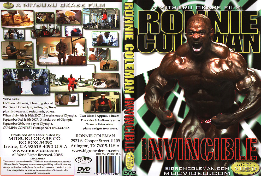 | Ronnie Coleman – Invincible A primeira parte deste DVD foi filmado em 09 de julho e 10 de 2007, sobre a semana fora de temporada final, de Ronnie. Este foi de 12 semanas a partir da Olympia de 2007. Em seguida, mais taping novamente em 03 de setembro e 4 de 2007 – apenas 3 semanas fora do Olympia do ano passado. O DVD inclui uma verificação de corpo final pela nutricionista do Ronnie Chad Nicholls no dia do 28 Olympia, de setembro de 2007 em seu quarto de hotel. Ronnie menciona que sua dieta mudou desde o ano passado e explica como e por quê. Seu regime de treinamento de peso também mudou. Todas as sessões de treinamento foram filmadas em casa ginásio do Big Ron no Texas. CONTEÚDO: Ronnie fala I & II. |