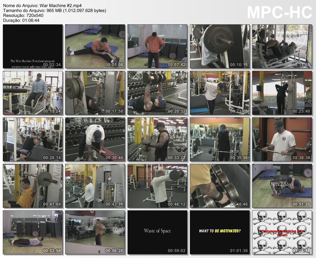 Instrui você sobre como adquirir o físico de War Machine. Aqui você aprenderá sobre: composições corporais adequadas, levantamento de peso, aquecimento e alongamento, a utilidade combativa dos grupos musculares, rotinas de treinamento com pesos, a importância do fortalecimento das mãos, corrida, o poder da música, parceiros de treino, lidar com a dor, descanso e esgotamento, diretrizes alimentares adequadas e os perigos dos esteroides anabolizantes.Combativos da Máquina de Guerra