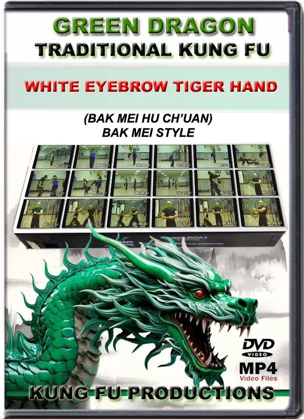Forma White Eyebrow enfatizando o estilo de movimento Tiger Animal. Os conjuntos White Eyebrow empregam a característica ”postura para trás” e ”passo de soco” associados a este estilo único, bem como os blocos simples e duplos do estilo Pa Kua, tanto eretos quanto invertidos. Não dedicado ao uso exclusivo do Phoenix Eye Fist e, portanto, muito mais flexível. Excelente para controle da linha central e luta corpo a corpo. Técnicas excelentes. Um favorito aqui no Green Dragon!