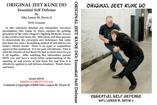 | Essencial Self Defense Nesta apresentação extremamente detalhada e informativa de 1,5 horas, Sifu Lamar M. Davis explica os princípios orientadores dos métodos de luta de Bruce Lee, conhecidos no mundo como Jeet Kune Do. Sifu Davis irá então demonstrar os princípios e técnicas que fazem do Jeet Kune Do um método de autodefesa tão devastador para as ruas violentas de hoje! Não há aspecto esportivo ou de competição nesta arte marcial. É por pura autodefesa. Foi isso que o fundador do Jeet Kune Do tinha em mente quando juntou tudo. Depois de assistir a este DVD repleto de informações, você terá uma compreensão muito melhor da incrível arte e ciência do Jeet Kune Do e como ele é efetivamente aplicado em situações de autodefesa. Assista, ouça e aprenda! —– |