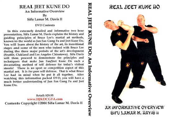 | Real Jeet Kune Do Nesta apresentação extremamente detalhada e informativa de duas horas, Sifu Lamar M. Davis explica a história e os princípios orientadores dos métodos de artes marciais de Bruce Lee, conhecidos no mundo como Jun Fan Gung Fu e Jeet Kune Do. Você aprenderá sobre a história da arte, seus estágios de transição e alguns dos homens que treinaram com Bruce Lee durante os três principais períodos de desenvolvimento da arte (Seattle, Oakland e Los Angeles Chinatown). Sifu Davis irá então demonstrar os princípios e técnicas que fazem do Jun Fan/Jeet Kune Do um método de autodefesa tão devastador para as ruas violentas de hoje! Não há aspecto esportivo ou de competição nesta arte marcial. É por pura autodefesa. Isso é o que Bruce Lee tinha em mente quando juntou tudo. Depois de assistir a este vídeo repleto de informações, você terá uma compreensão muito melhor de Jun Fan Gung Fu e Jeet Kune Do. —– |