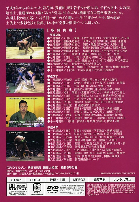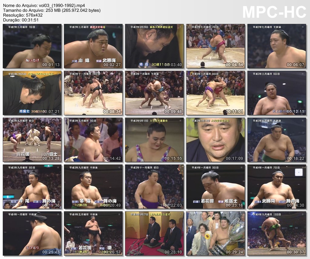 | Arte Nacional de Ozumo em Vídeo Ano de lançamento : 2010 Tipo de esporte : sumô Participantes : sekitori: Yokozuna, ozeki, sekiwake, komusubi… Duração : 40 minutos cada volume Descrição : A série de vídeos japonesa “A Arte Nacional do Sumo em Vídeo” cobre vários períodos do sumô da década de 1930. até os dias atuais. Esse dvd dura em media 40 minutos e é uma compilação de lutas, cerimônias significativas, etc. National Art Of Ozumo On Video Vol.3 (1990-1992): – Haru 1990: – Promotion of Sekiwake Kirishima to Ozeki – Natsu 1990: – Nagoya 1990: – Promotion of Ozeki Asahifuji to Yokozuna – Kyushu 1990: – Hatsu 1991: – Haru 1991: – Natsu 1991: – Couple of fun frames – Nagoya 1991: – Aki 1991: – Kyushu 1991: – Hatsu 1992: – Natsu 1992: – Promotion of Sekiwake Akebono to Ozeki – Nagoya 1992: – Aki 1992: |