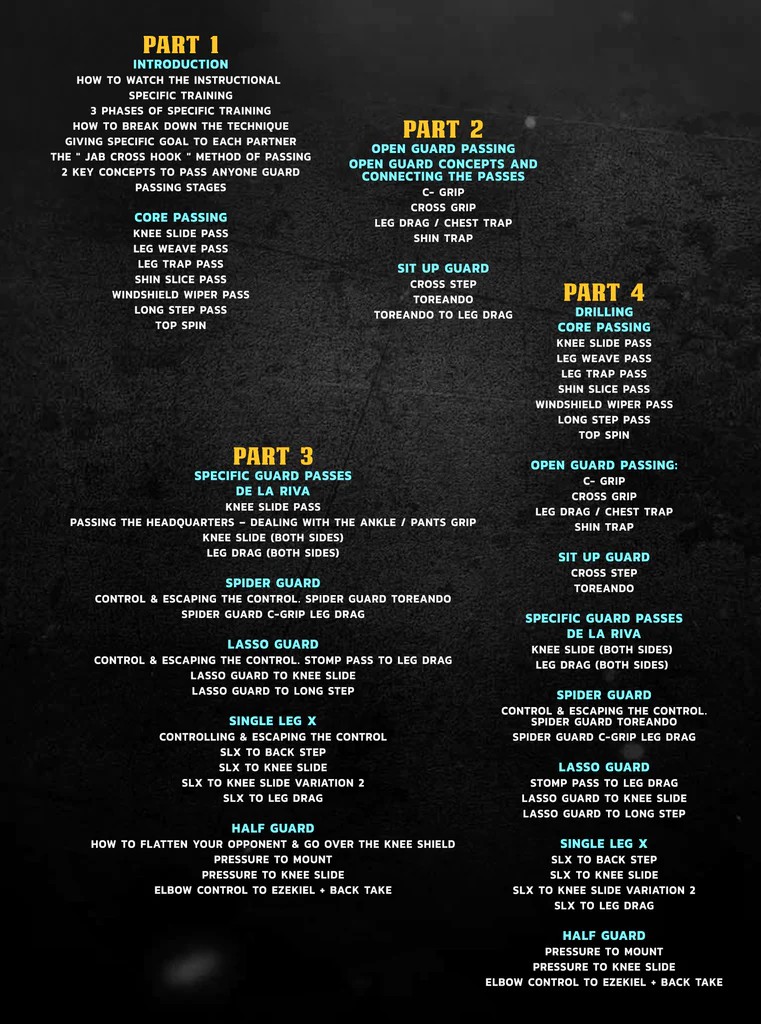 ·         Nesta série de 4 volumes, você obterá um modelo que poderá usar para avançar em seus passes, com passes específicos como leg drag, knee slide, leg weave e muito mais, todos detalhados