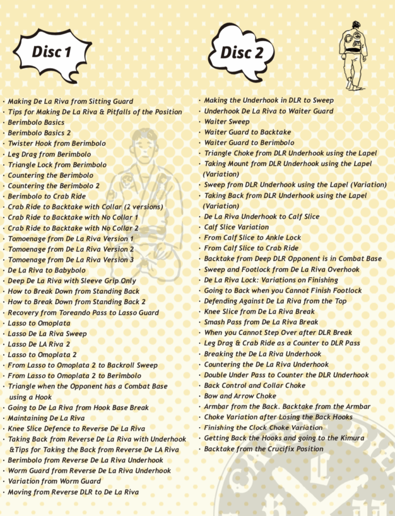 Como o título sugere, este DVD é uma coleção de 66 técnicas relacionadas à posição De La Riva. Inclui técnicas comprovadas e eficazes escolhidas a dedo, que estudei com os principais competidores mundiais, como Caio Terra e Mikey Musumeci.