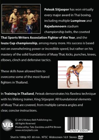 | Peteak Sitjaopor venceu praticamente todos os grandes prêmios em boxe tailandês, incluindo vários cinturões de campeões do estádio Lumpinee e Rajadamnoern, o cobiçado campeão da Associação de Escritores Esportivos Tailandeses e os campeonatos da Copa Isuzu, entre muitos outros. Seu sucesso não é baseado em poder esmagador ou velocidade incrível, mas sim em seu domínio das bases sólidas do Muay Thai; chutes, socos, joelhos, cotovelos, conquista e táticas defensivas. Essas habilidades permitiram que ele superasse alguns dos lutadores mais temidos da Tailândia. Em Treinamento na Tailândia, Peteak demonstra sua técnica impecável com seu treinamento vitalício, King Sitjaopor. Todos os elementos fundamentais do Muay Thai são cobertos, de múltiplos anjos de câmera e instruções claras e concisas. |