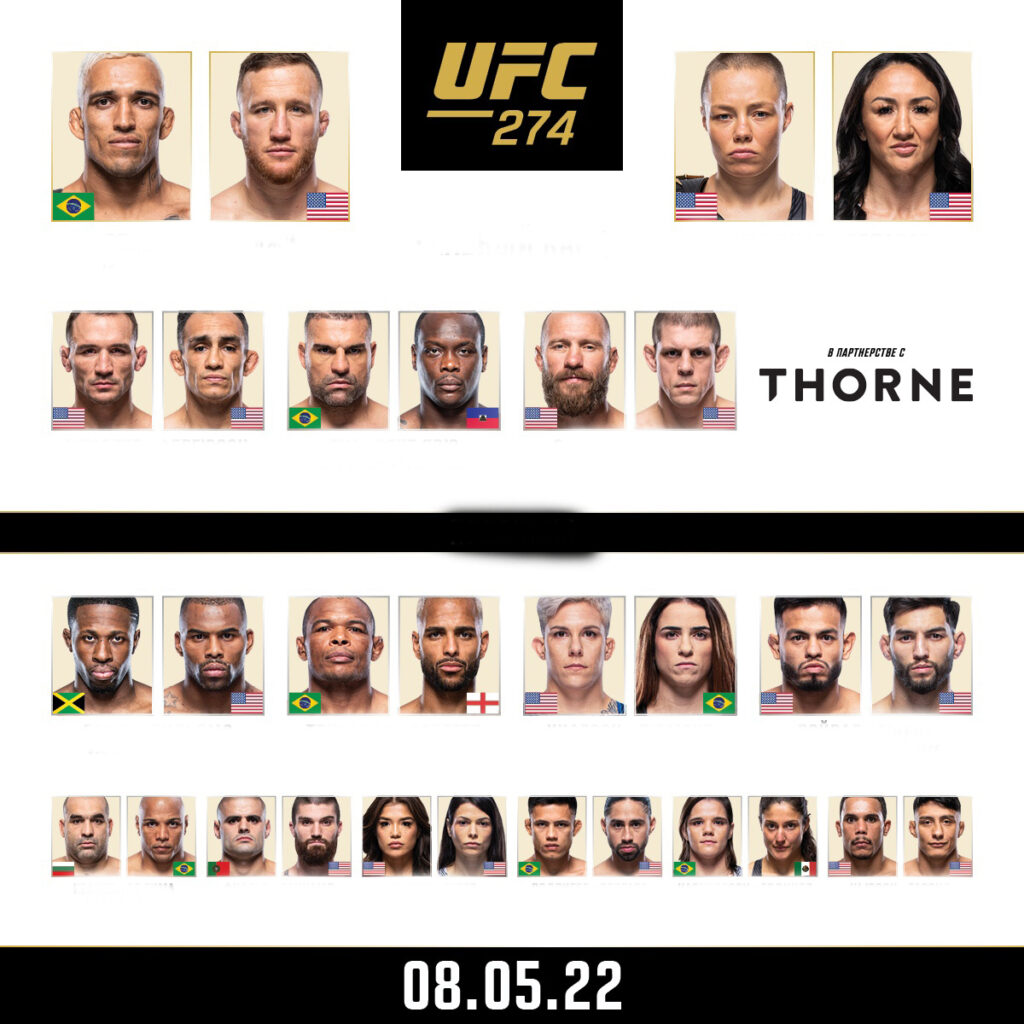Descrição : No dia 08 de maio, em Phoenix (Arizona, EUA), aconteceu na arena Footprint Center o torneio numerado do UFC 274. Na luta principal da noite, o campeão dos leves do UFC Charles Oliveira enfrentou o primeiro número do ranking da melhores lutadores da divisão e um dos lutadores mais espetaculares do nosso tempo Justin Gaethje.