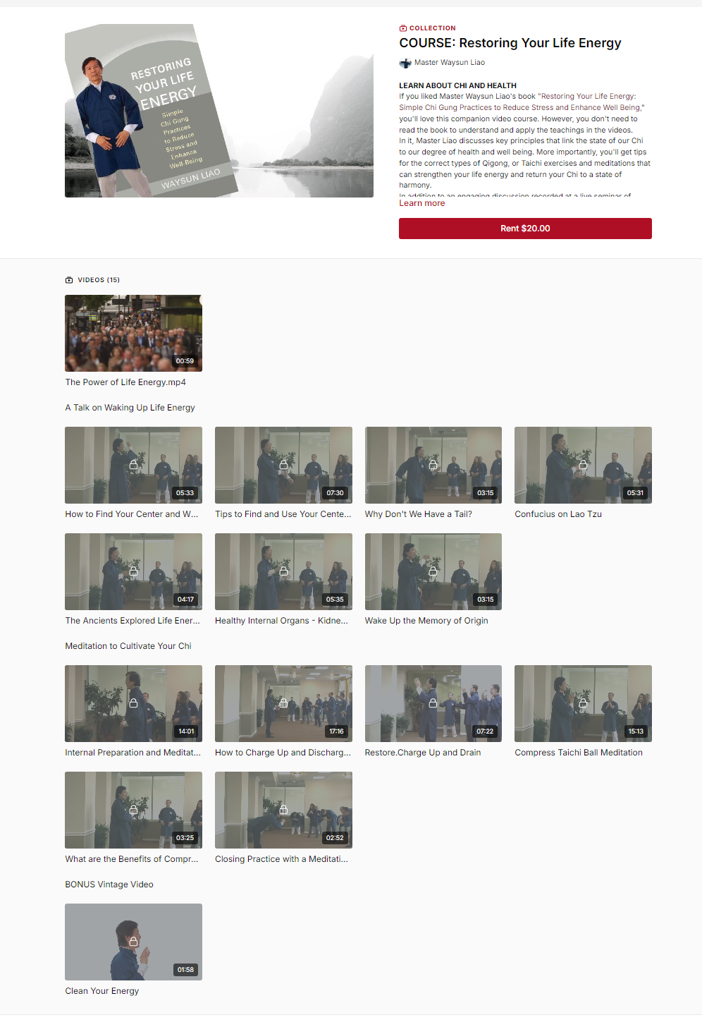 Se você gostou do livro do Mestre Waysun Liao “Restaurando sua energia vital: práticas simples de Chi Gung para reduzir o estresse e melhorar o bem-estar, ” você vai adorar este curso em vídeo complementar. No entanto, você não precisa ler o livro para compreender e aplicar os ensinamentos dos vídeos.