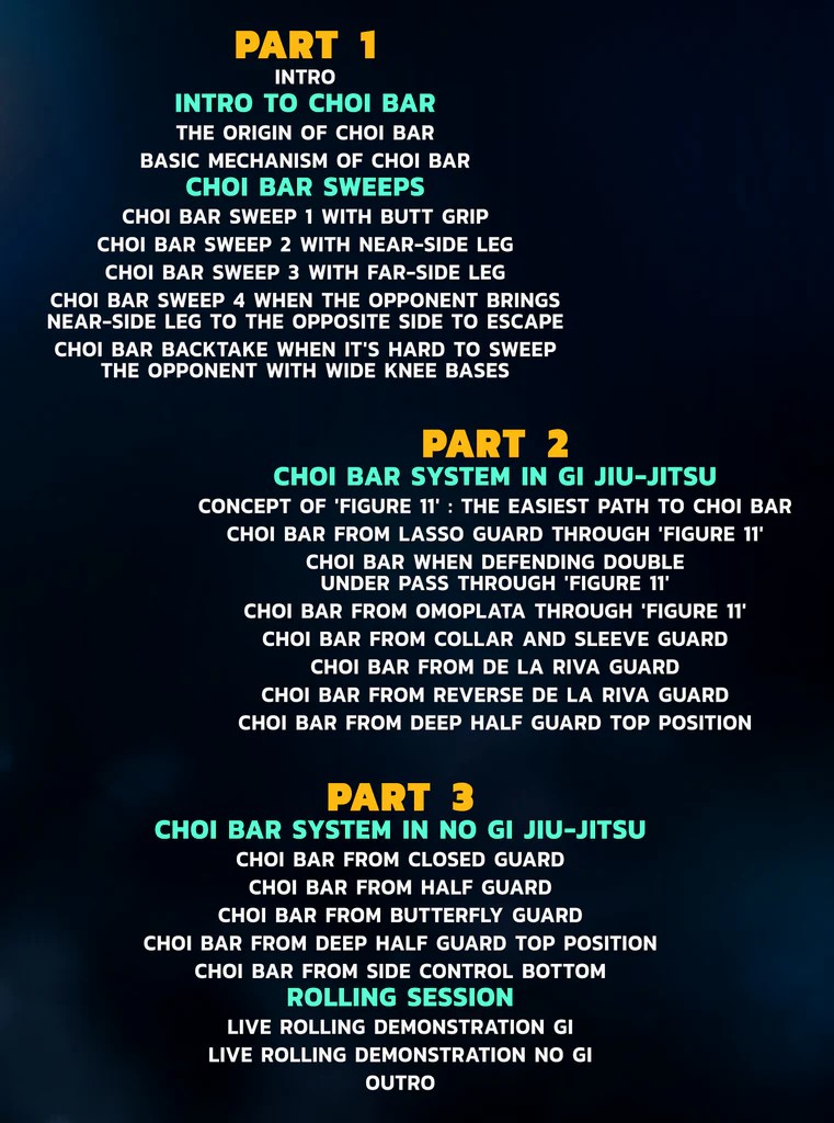 • Junte-se ao grupo de lutadores habilidosos que se beneficiaram da experiência de Yongwon Choi no Jiu-Jitsu brasileiro e torne-se um competidor mais formidável e confiante com suas técnicas comprovadas para dominar a barra Choi.